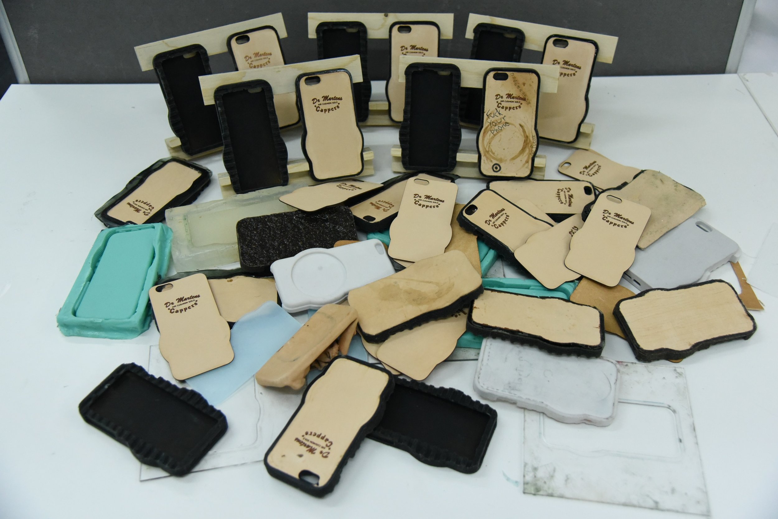 The manufacturing process involved creating one-part silicone molds from a 3D printed model. Meanwhile, the leather was laser cut into shape and laser etched with the vintage Dr. Marten 'Cappers' logo. The leather backs were centered and placed directly onto the rubber while casting for a permanent bond.